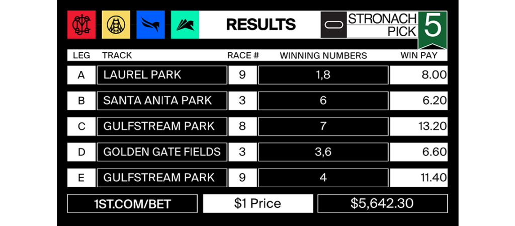 Races from Laurel, Santa Anita, Gulfstream, and Golden Gate BALTIMORE – There were 21 winning tickets in Friday’s Stronach 5 with each worth $5,642.30. The Stronach 5 featured races from Laurel Park, Santa Anita Park, Gulfstream Park, and Golden Gate Fields with a low 12-percent takeout. Two of the five legs produced payouts of more […]
