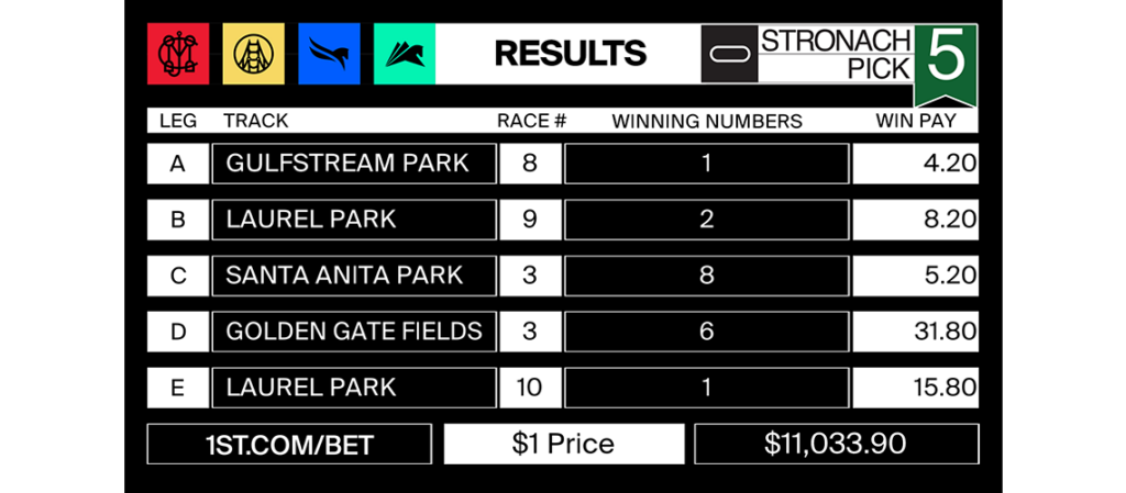 Low 12-Percent Takeout BALTIMORE – There were 12 winning tickets in Friday’s Stronach 5, each worth $11,033.90. The Stronach 5 featured a low 12-percent takeout and races from Gulfstream Park, Laurel Park, Santa Anita Park and Golden Gate Fields. The popular wager started with an even-money shot in Alecka Star returning from a 4 ½-month […]